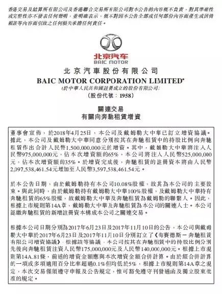 公告稱,增資完成后,奔馳租賃的注冊資本將由約20.98億元增至約35.98億元。其中,戴姆勒大眾化持有65%,北京汽車持有35%。北京汽車在公告中稱,根據(jù)上市規(guī)則,戴姆勒大中華及奔馳租賃成其關(guān)聯(lián)人士。